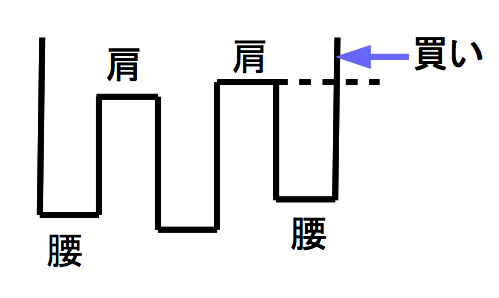 おかめ逆三尊では、直近高値の「肩」を価格が抜いてきた時点(青色の矢印)が、買いのポイントとなります。