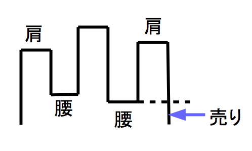 おかめ三尊では、直近安値の「腰」を価格が割ってきた時点(青色の矢印)が、売りのポイントとなります。