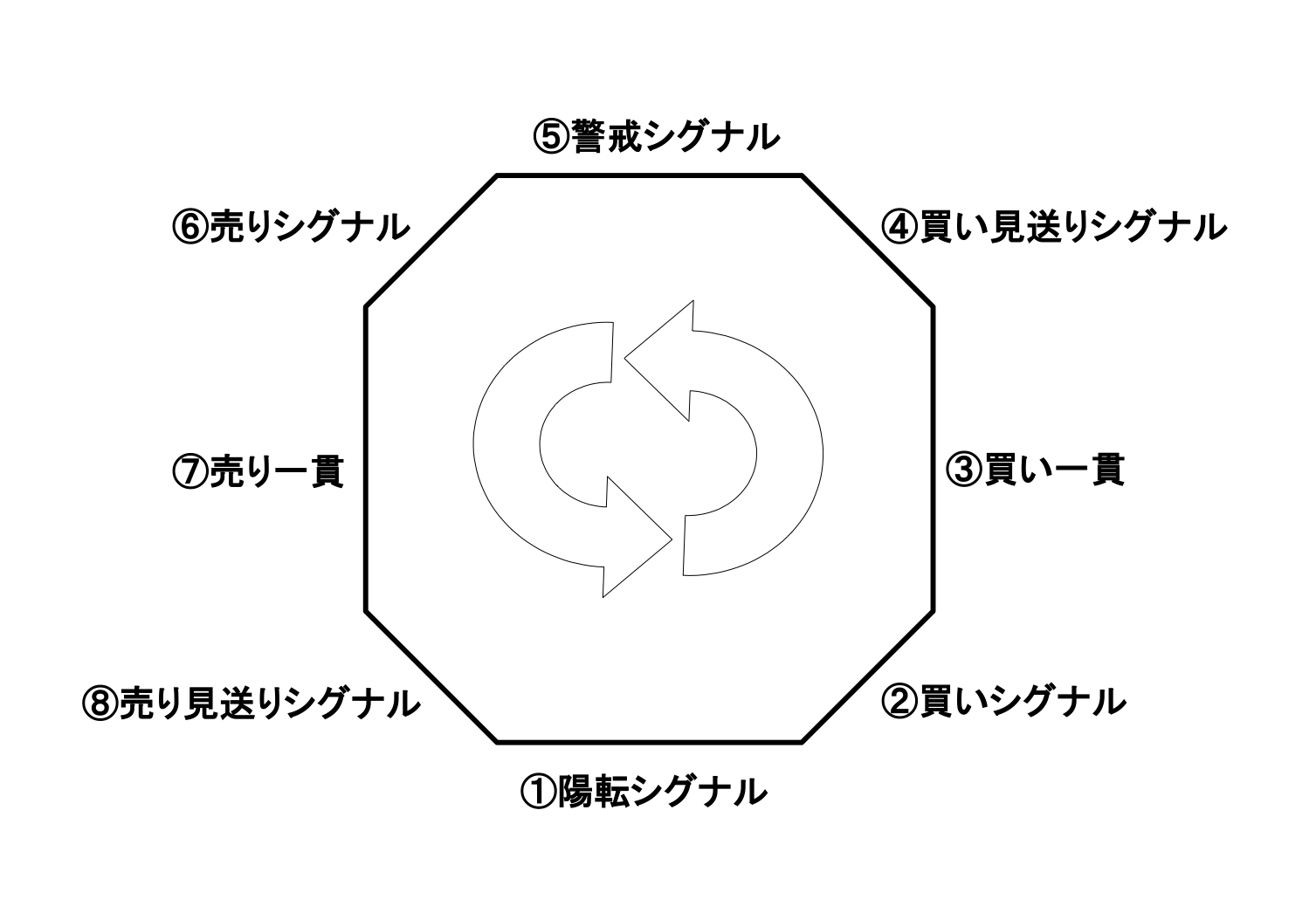 また、逆ウォッチ曲線は、相場が上昇して下落する局面においては、反時計回りで以下のような八角形の型が形成されることが多く、