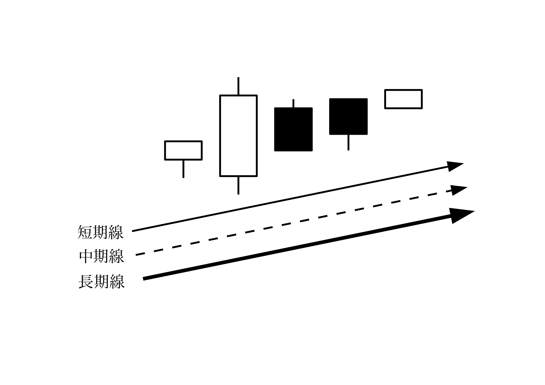 前ページで述べましたが、移動平均線は長期線であればあるほどその信頼度は増します。ゆえに、前ページの例で述べますと、日足チャートでは長期線である75日線が一番信頼できる移動平均線となります。