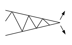 対象三角型は収束点に近づいた後、陽線が出れば上昇トレンド、陰線が出れば下降トレンドを築きやすい傾向があります。三角型の中で価格が揉み合っている時は、以後どちらに価格が進むのかはわかりません。収束点で陽線が出るか陰線が出るかで今後のトレンドを占うしかありません。ただし、実際の相場では、図のように綺麗な三角型を築くことはあまりありません。その前にレジスタンスラインを上抜けるかサポートラインを下抜けるかで勝負が決まることが多いです。よって、収束点前から価格がどちらに振れるか注視しておく必要があります。